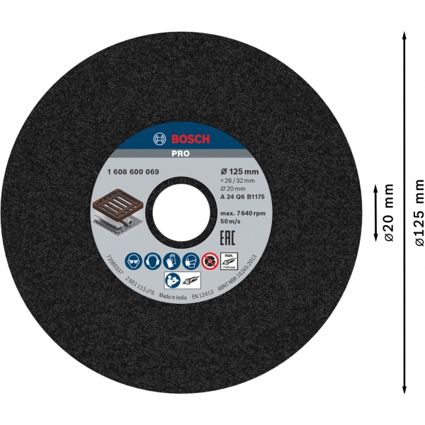 | Información adicional | Diámetro: 125 mm Espesor: 26/32 mm. Diámetro del agujero: 20 mm Granulación: 24 |