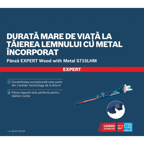 Hasta 50 veces más durabilidad que una hoja de sierra Bosch S611DF en materiales duros