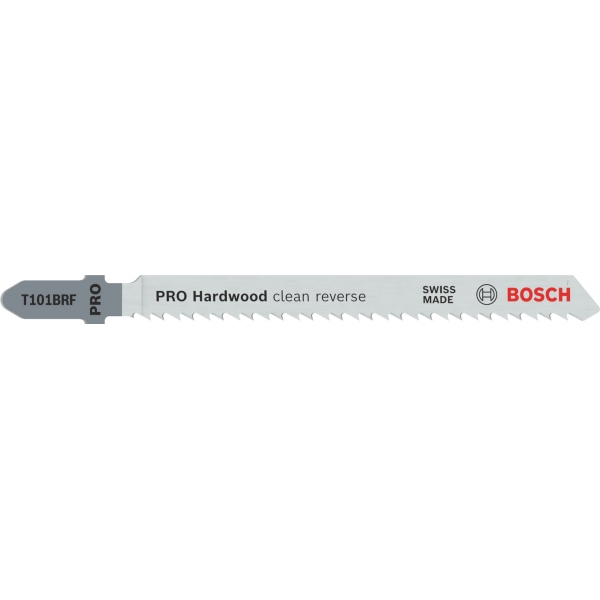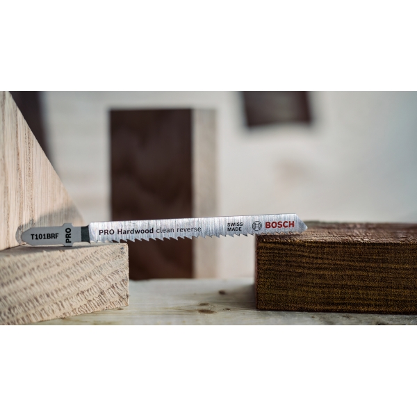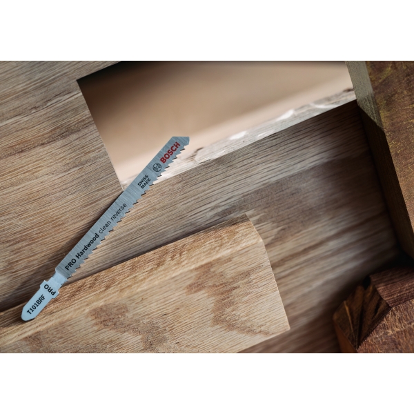 Hemos creado la hoja de sierra de calar PRO Hardwood Clean Reverse T101BRF en bimetal: cuenta con una banda de dientes de acero de alta velocidad (HSS) unidos a un cuerpo de acero de alto carbono (HCS) para garantizar que pueda trabajar con madera dura y laminados durante mucho tiempo. La hoja tiene una forma cónica y dientes de paso fino con diseño invertido que le permiten realizar cortes sin desgarros en la parte superior de piezas de hasta 30 mm de espesor.