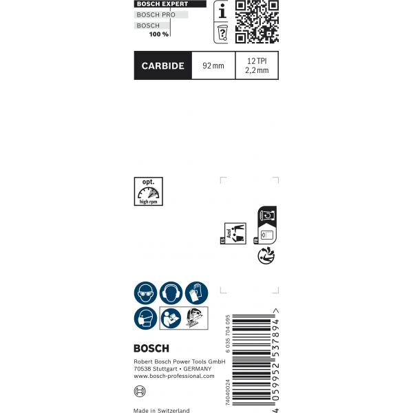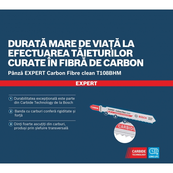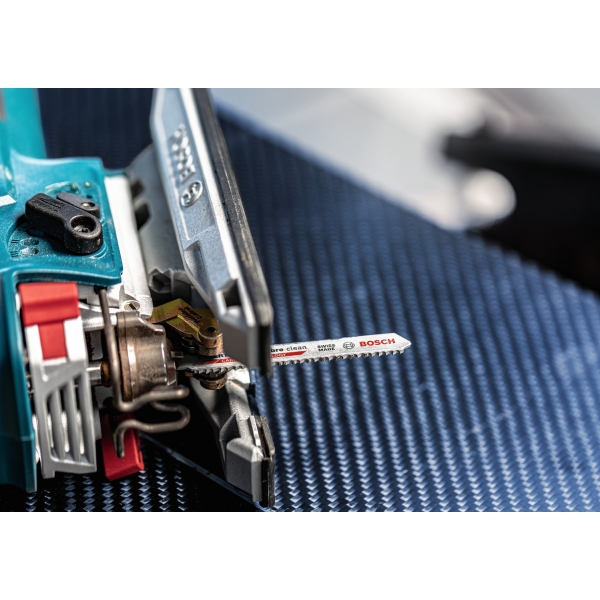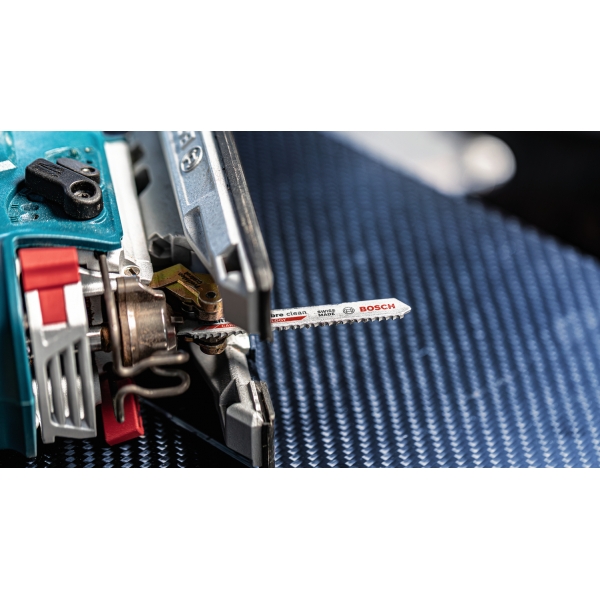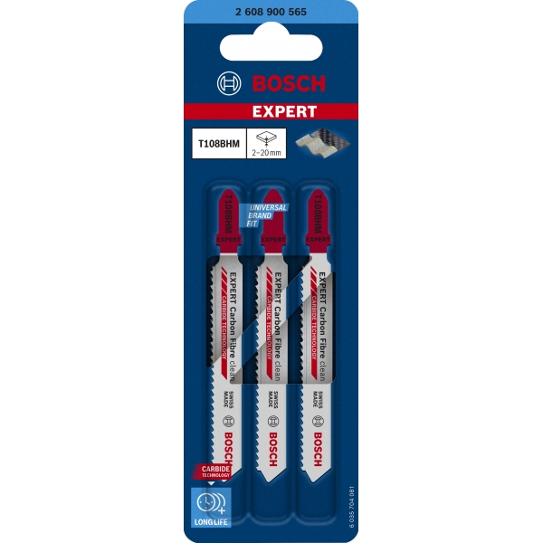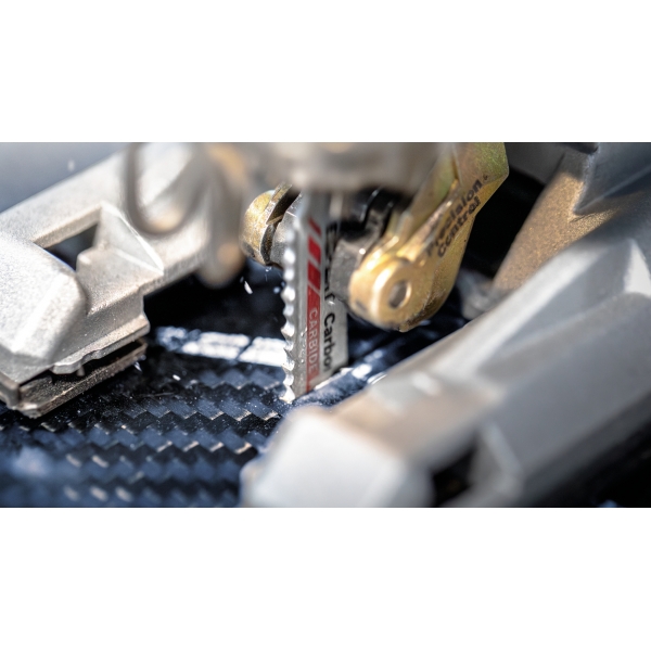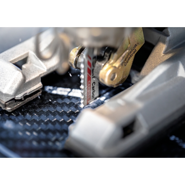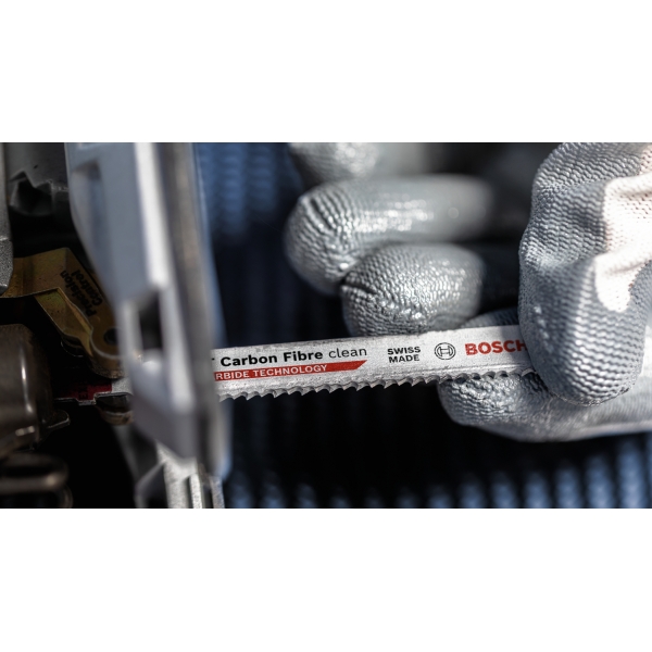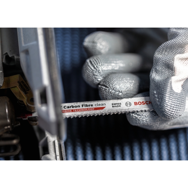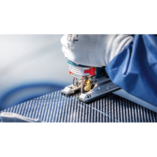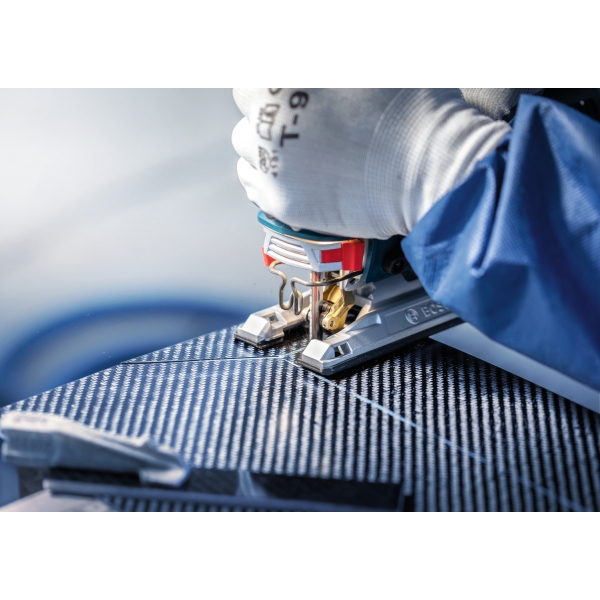 La hoja de sierra de calar Bosch EXPERT Carbon Fibre clean T108BHM ha sido diseñada para satisfacer las exigentes exigencias de los materiales compuestos plásticos modernos utilizados en las industrias aeroespacial y automotriz. Su geometría dentada está optimizada para evitar la delaminación al cortar fibra de carbono y cumplir con los altos estándares que exigen estas aplicaciones. Con una tira dentada de carburo soldada por láser al cuerpo, también ofrece una excelente vida útil en estos materiales exigentes.