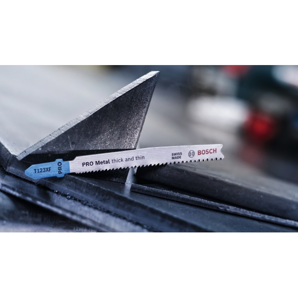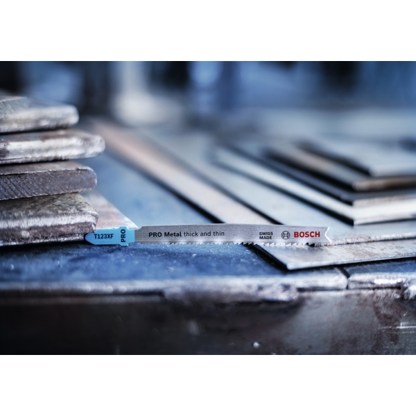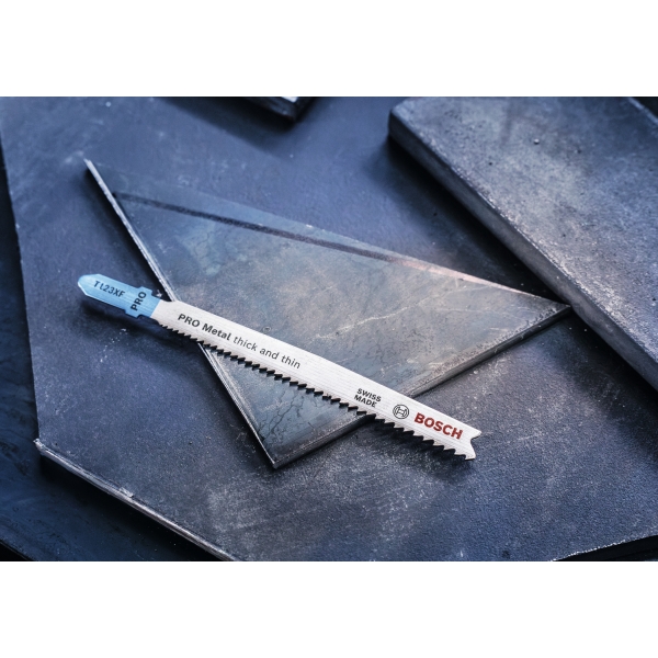 ¿Trabaja en metal y busca una hoja de sierra de calar resistente para cortar chapa de varios grosores, así como tubos y perfiles pequeños? El versátil modelo PRO Metal T123XF, para cortes gruesos y finos, cuenta con un paso de diente progresivo que le permite trabajar con piezas metálicas gruesas y delgadas por igual.