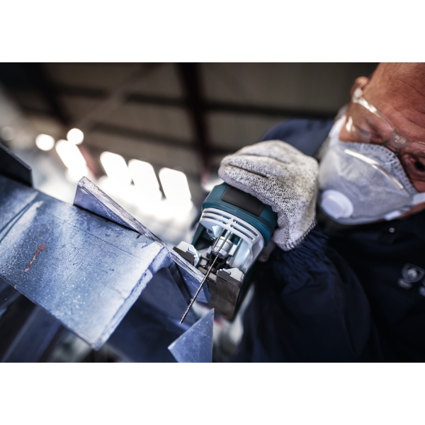 La fresadora PRO Metal T123XF, gruesa y delgada, está fabricada en bimetal. Cuenta con una banda de dientes de acero de alta velocidad (HSS) adherida a un cuerpo de acero de alto carbono (HCS). Esto la hace duradera y resistente para trabajar con chapa metálica de hasta 8 mm de espesor, así como con tubos y perfiles de hasta 25 mm de diámetro. Sus dientes robustos, fresados y ondulados, y su paso progresivo garantizan cortes rápidos y rectos en piezas de entre 1,5 y 8 mm de espesor.