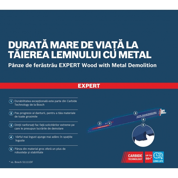 Hasta 50 veces más durabilidad que una hoja de sierra Bosch S1111DF en materiales duros
