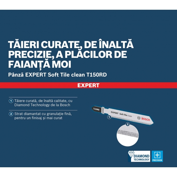 Esta exclusiva hoja de sierra de calar consta de un grano de diamante soldado a un cuerpo de acero al carbono de alta elasticidad. Por ello, es ideal para cortes de ajuste fino en baldosas cerámicas blandas. La precisión de la hoja se debe a la tecnología de diamante de Bosch: el grano de la EXPERT Soft Tile clean T150RD es extrafino para un acabado preciso.
