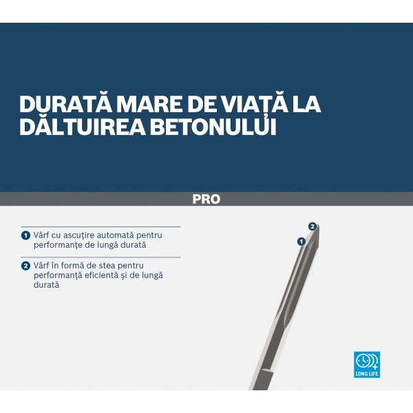 El PRO HEX 28-5C es un cincel resistente y duradero que permite romper hormigón y ladrillos en diversas estructuras (edificios, carreteras y puentes) al realizar trabajos de demolición o excavar para exponer armaduras. Su punta en forma de estrella, con afilado automático, garantiza un rendimiento duradero.