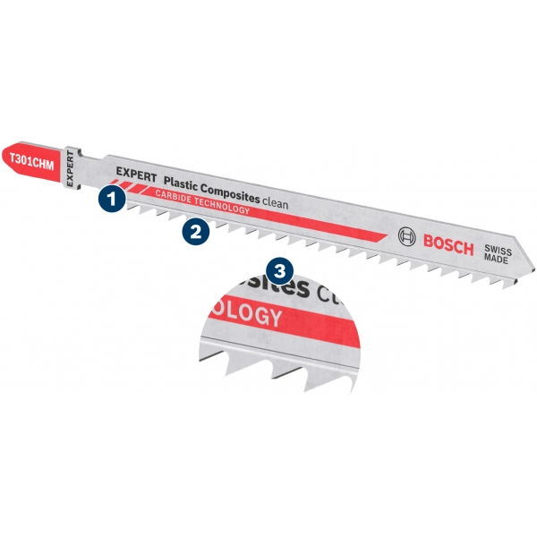 La extrema durabilidad de la hoja está respaldada por la tecnología de carburo (Carbide Technology) de Bosch: los dientes se afilan por fricción transversal, a partir de una sola tira del metal más duro.