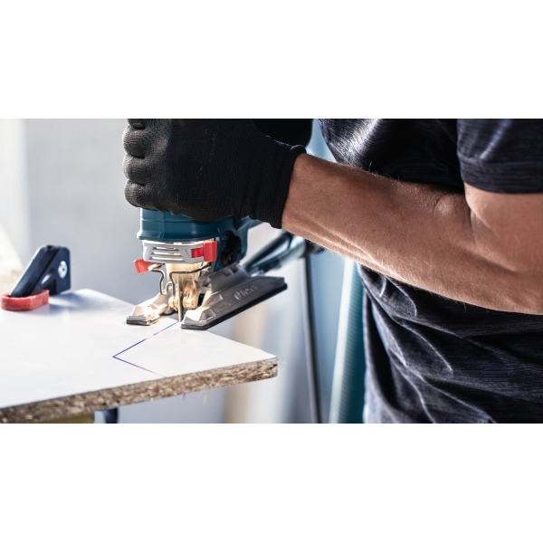 Entre instaladores y carpinteros, siempre ha sido un arte asegurarse de que el lado limpio del corte de la caladora quede en la cara visible de la pieza. A veces se puede girar la pieza, otras veces se puede sostener la caladora boca abajo. También se puede usar la hoja de sierra EXPERT Hardwood de 2 caras limpias, que garantiza un corte perfecto y sin astillas en ambos lados gracias a sus dientes opuestos.