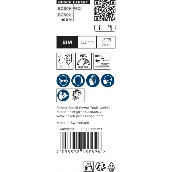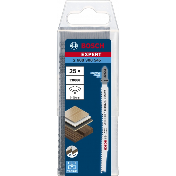 Fabricada en bimetal (una lámina de acero de alta velocidad adherida a una hoja de acero flexible que combina resistencia y flexibilidad), la hoja de sierra de calar Bosch EXPERT Hardwood de 2 caras limpia es lo suficientemente robusta como para cortar encimeras de cocina laminadas o de madera dura. Disponible en una versión para cortes rectos sin astillas (T308BF) y en una versión para cortes angulares especialmente precisos sin astillas (T308BFP).