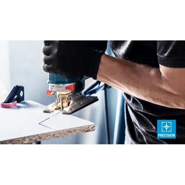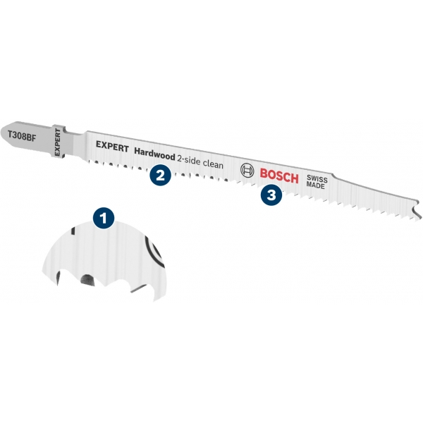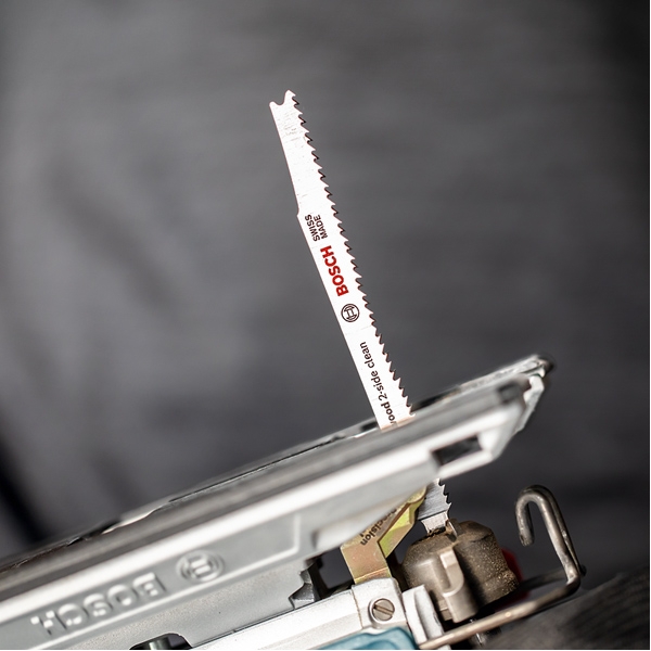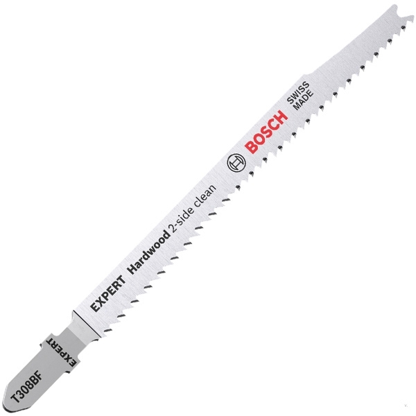 Hecha de bimetal, una tira de acero completamente endurecido de alta velocidad unido a una hoja de acero flexible para combinar resistencia y flexibilidad, la hoja de sierra vertical limpia de 2 lados EXPERT Hardwood de Bosch es lo suficientemente fuerte como para cortar encimeras de cocina de tableros aglomerados laminados. o madera dura.