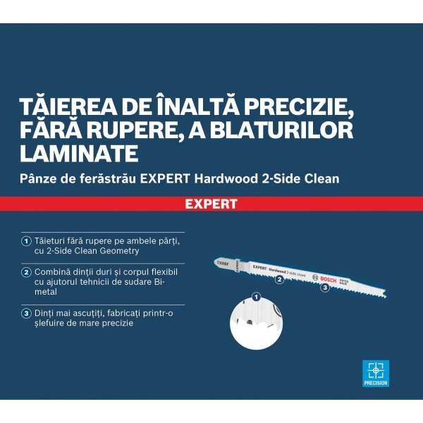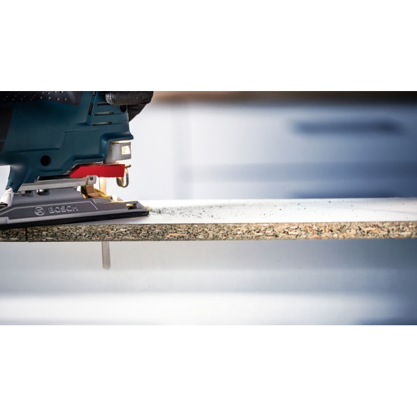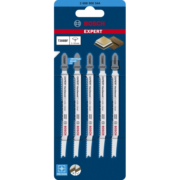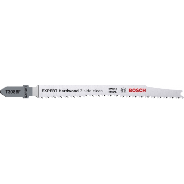 Fabricada en bimetal (una lámina de acero de alta velocidad adherida a una hoja de acero flexible que combina resistencia y flexibilidad), la hoja de sierra de calar Bosch EXPERT Hardwood de 2 caras limpia es lo suficientemente robusta como para cortar encimeras de cocina laminadas o de madera dura. Disponible en una versión para cortes rectos sin astillas (T308BF) y en una versión para cortes angulares especialmente precisos sin astillas (T308BFP).