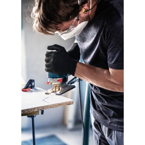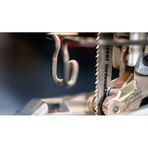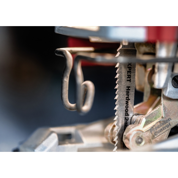 Entre instaladores y carpinteros, siempre ha sido un arte asegurarse de que el lado limpio del corte de la caladora quede en la cara visible de la pieza. A veces se puede girar la pieza, otras veces se puede sostener la caladora boca abajo. También se puede usar la hoja de sierra EXPERT Hardwood de 2 caras limpias, que garantiza un corte perfecto y sin astillas en ambos lados gracias a sus dientes opuestos.