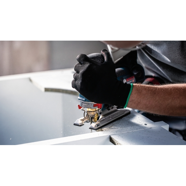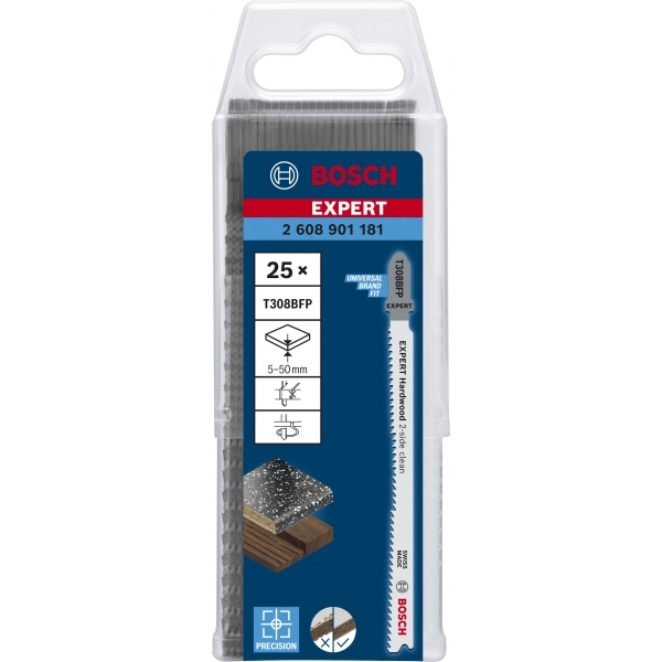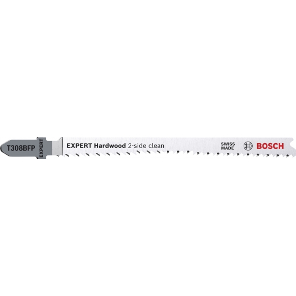 Fabricadas con bimetal (una lámina de acero de alta resistencia adherida a una hoja de acero flexible que combina resistencia y flexibilidad), las hojas de sierra de calar Bosch EXPERT Hardwood de 2 caras limpias son lo suficientemente robustas como para cortar encimeras de cocina de aglomerado o madera dura. Disponibles en una versión para cortes rectos sin astillas (T308BF) y en una versión para cortes angulares especialmente precisos sin astillas (T308BFP).