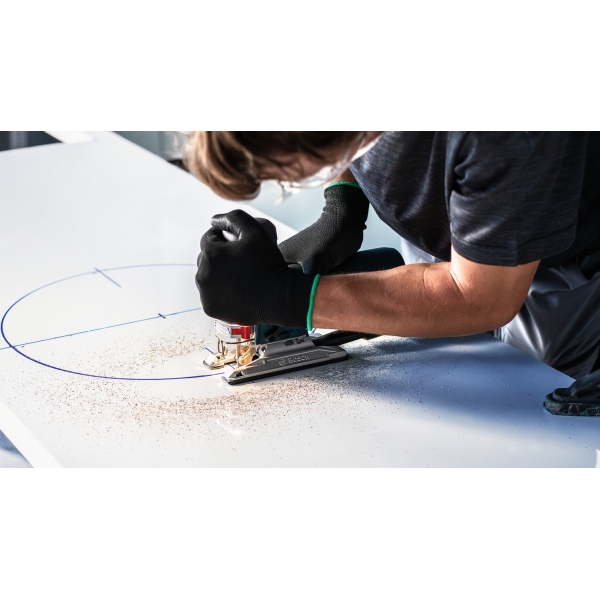 Entre instaladores y carpinteros, siempre ha sido un arte asegurarse de que el lado limpio del corte de la sierra de calar quede en la cara visible de la pieza. A veces se puede girar la pieza, otras veces se puede sostener la sierra de calar boca abajo. También se puede usar la hoja de sierra EXPERT "Hardwood 2-side clean", que proporciona un corte perfecto y sin astillas en ambos lados gracias a sus dientes opuestos.
