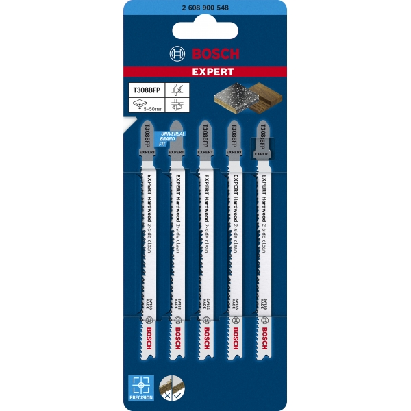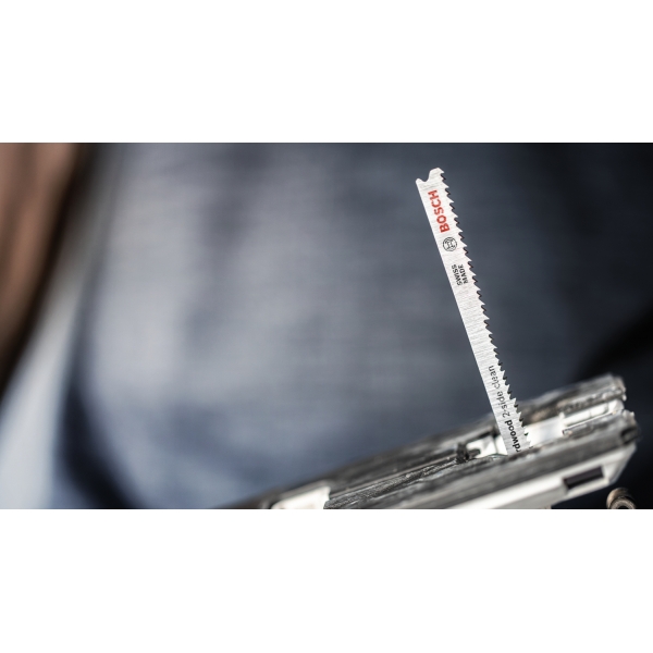 Fabricadas con bimetal (una lámina de acero de alta resistencia adherida a una hoja de acero flexible que combina resistencia y flexibilidad), las hojas de sierra de calar Bosch EXPERT Hardwood de 2 caras limpias son lo suficientemente robustas como para cortar encimeras de cocina de aglomerado o madera dura. Disponibles en una versión para cortes rectos sin astillas (T308BF) y en una versión para cortes angulares especialmente precisos sin astillas (T308BFP).
