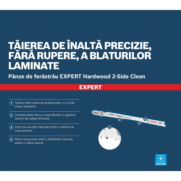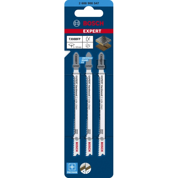 Fabricadas con bimetal (una lámina de acero de alta resistencia adherida a una hoja de acero flexible que combina resistencia y flexibilidad), las hojas de sierra de calar Bosch EXPERT Hardwood de 2 caras limpias son lo suficientemente robustas como para cortar encimeras de cocina de aglomerado o madera dura. Disponibles en una versión para cortes rectos sin astillas (T308BF) y en una versión para cortes angulares especialmente precisos sin astillas (T308BFP).