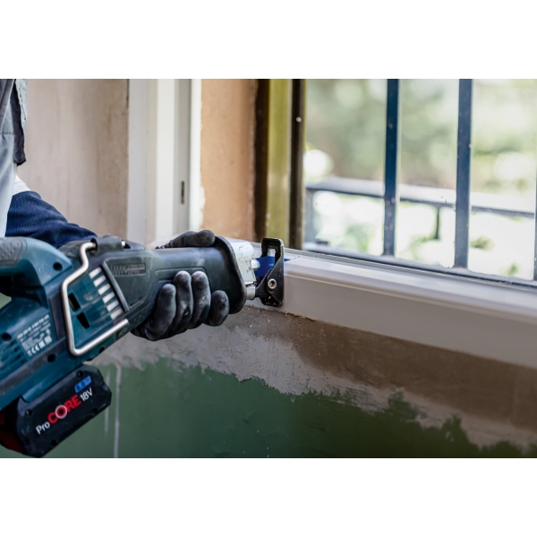 Combinando durabilidad, eficiencia y la capacidad absoluta para cualquier trabajo de demolición de ventanas y puertas, la hoja de sierra recíproca Bosch EXPERT Window Demolition S956DHM es, sin duda, la favorita de los instaladores de ventanas. Resiste incluso el contacto con mampostería, mortero y yeso.