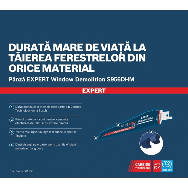 La hoja de sierra de sable Bosch EXPERT Window Demolition S956DHM es ideal para la demolición de ventanas moderna. Basada en la tecnología de carburo de Bosch, sus dientes desgarran los tornillos de fijación más duros y resistentes, y resisten para volver a hacerlo. Su corta longitud, la punta cónica y los dientes de carburo dispuestos en un lado están diseñados para una tarea específica: esta es nuestra especialista para ventanas y puertas, ya sean de madera, plástico o materiales compuestos.
