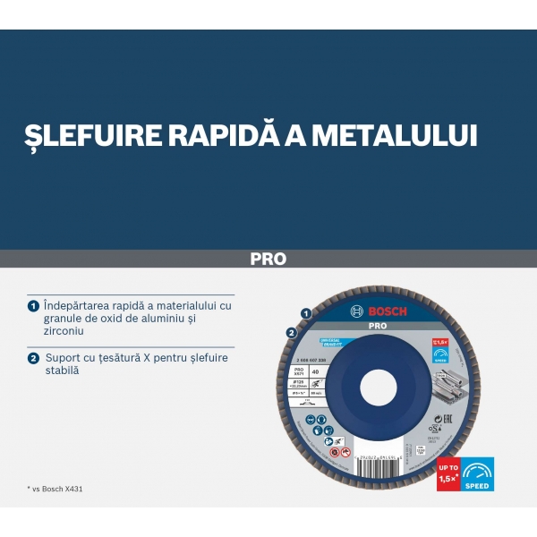 El disco de láminas PRO X571 cuenta con un soporte de tejido X para un lijado estable. La avanzada fusión de granos de óxido de aluminio y circonio garantiza una eliminación de material muy rápida y hace que este disco de láminas sea eficaz, incluso en acero templado.
