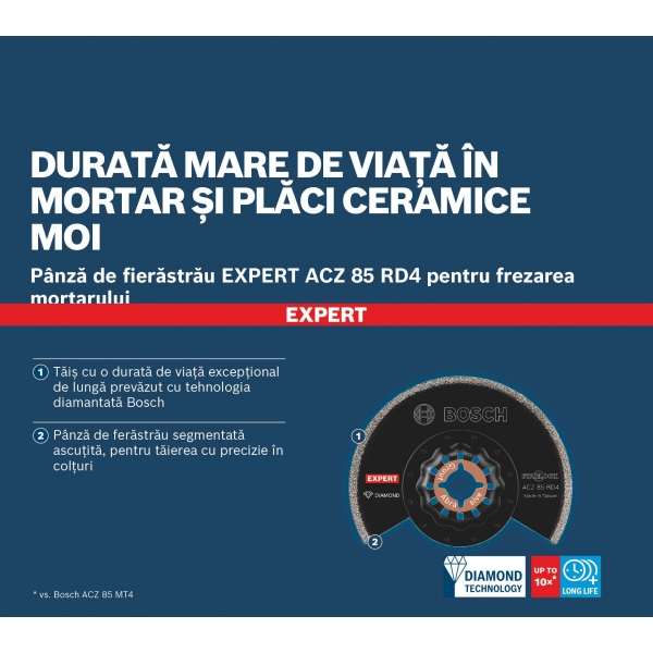 La EXPERT ACZ 85 RD4 ofrece una vida útil extremadamente larga gracias al uso avanzado de elementos de diamante. La tecnología de diamante de Bosch proporciona un corte fino con granos de diamante finos, que ofrecen la máxima resistencia al desgaste al trabajar con mortero duro. Estos granos son lo suficientemente duros como para permitirle realizar otros usos: también permite realizar pequeños cortes de ajuste en baldosas cerámicas blandas.
