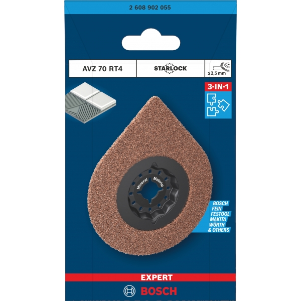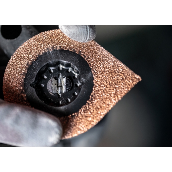 Su exclusiva forma de lágrima permite a la EXPERT AVZ 70 RT4 3 max realizar tres operaciones distintas al reparar baldosas cerámicas, lo que le otorga una excelente relación calidad-precio y garantiza un funcionamiento impecable. Gracias a su grano de carburo de alta calidad, corta fácilmente el mortero alrededor de las baldosas cerámicas y llega incluso a los rincones más estrechos gracias a su punta afilada. La EXPERT AVZ 70 RT4 3 max también funciona como almohadilla de lijado para eliminar el mortero viejo de detrás de las baldosas.