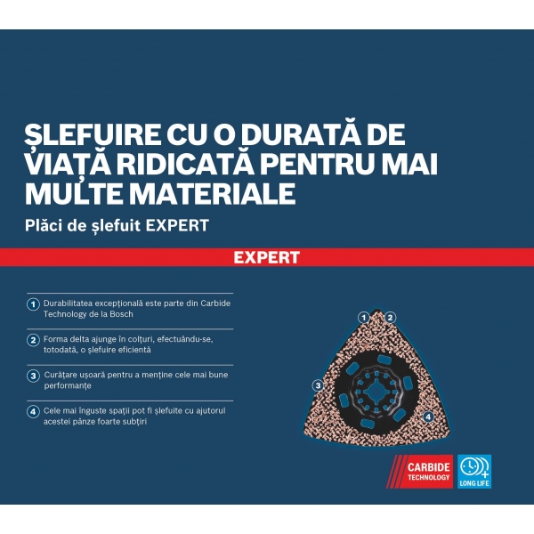 Gracias a la tecnología de carburo de Bosch, el grano de metal más duro se fija firmemente a la superficie. Este grano afilado conserva su eficacia durante toda su larga vida útil, ya que se puede limpiar con disolvente. La placa lijadora EXPERT está diseñada para múltiples materiales y usuarios.