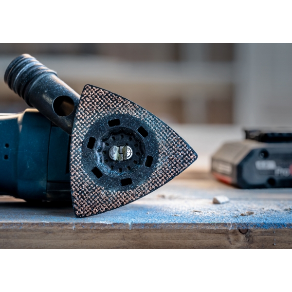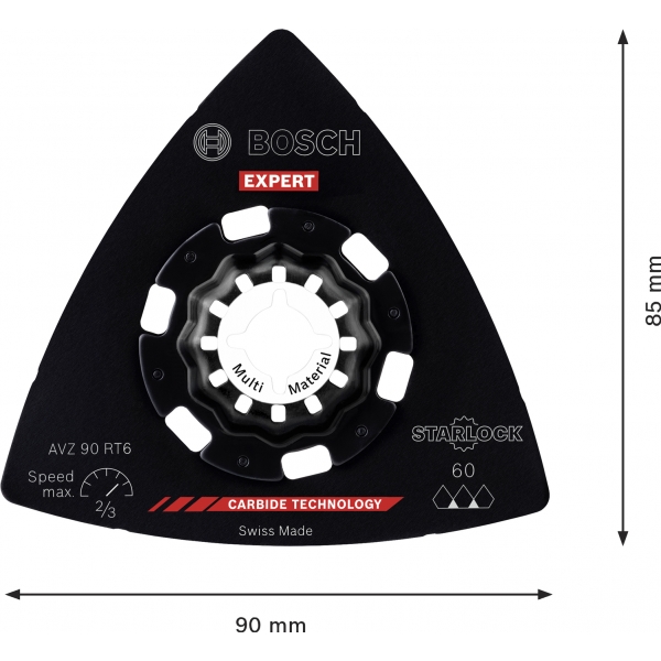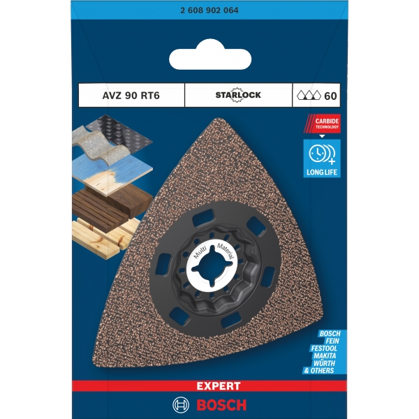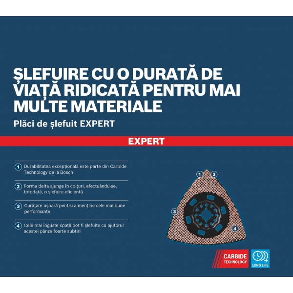 Gracias a la tecnología de carburo de Bosch, el grano de metal más duro se fija firmemente a la superficie. Este grano afilado conserva su eficacia durante toda su larga vida útil, ya que se puede limpiar con disolvente. La placa lijadora EXPERT está diseñada para múltiples materiales y usuarios.
