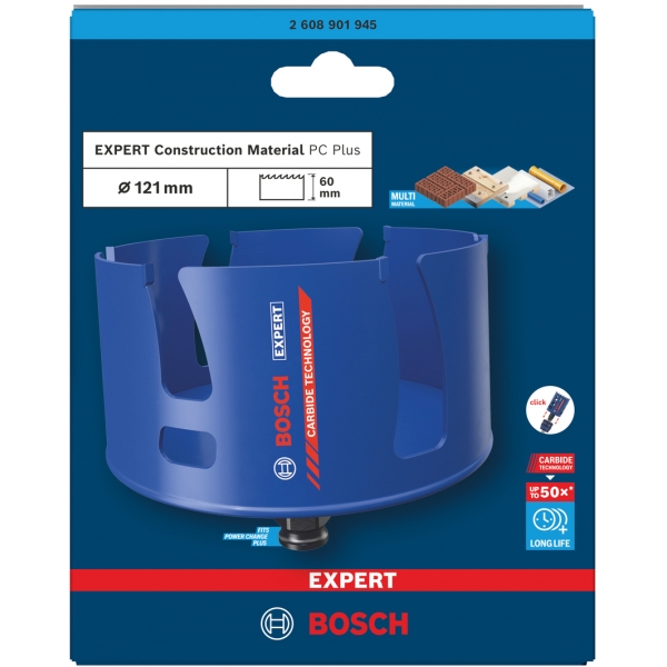 Con tan solo unos dientes gigantes de carburo en su cuerpo de acero, la EXPERT Construction Material PC Plus corta con potencia. Sus amplias ranuras están optimizadas para una rápida evacuación de las virutas, lo que permite cortar cualquier material, desde ladrillo hasta madera y aglomerado, con gran rapidez. La tecnología de carburo de Bosch es una combinación óptima de los materiales más duros y garantiza una vida útil extremadamente larga.