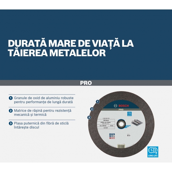 El duradero disco de corte PRO Metal utiliza granos de óxido de aluminio de primera calidad para realizar cortes rápidos y eficientes en metal. Combinamos los granos abrasivos con rellenos funcionales y los incorporamos en una matriz de resina fenólica para mayor resistencia y un rendimiento estable. Reforzamos el disco con fibra de vidrio de alta calidad para garantizar su uso seguro con motosierras.
