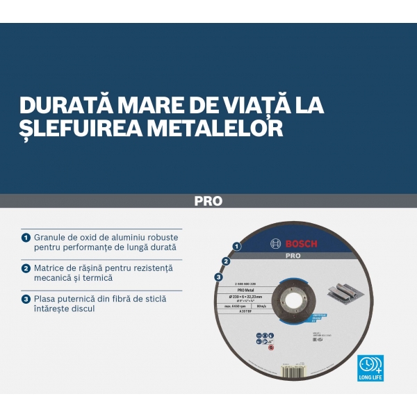 El duradero disco de desbaste PRO Metal utiliza grano de óxido de aluminio de alta calidad para desbastar eficazmente metal y acero. Combinamos el grano con materiales de relleno funcionales y los incorporamos en una matriz de resina fenólica para mayor resistencia, resistencia al calor y un rendimiento estable. Una malla de fibra de vidrio mecanizada con precisión refuerza el disco para mayor seguridad.