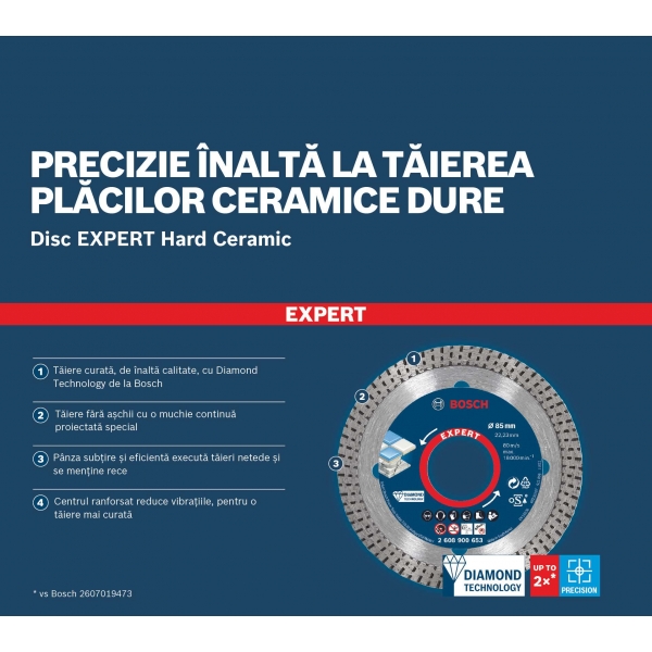 La tecnología Bosch Diamond, que incorpora nuevos diamantes a la superficie para garantizar un filo siempre afilado, permite que nuestro disco de corte cerámico corte incluso los azulejos más resistentes con facilidad. Su cuerpo delgado y resistente, y su filo continuo acanalado, garantizan el máximo control y reducen las vibraciones para obtener cortes de alta calidad y sin astillas.