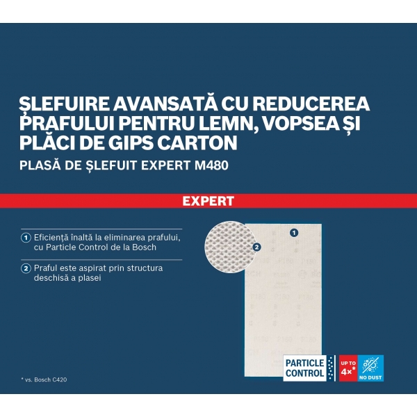 Reducir el polvo al lijar no es fácil, pero hemos encontrado una solución. Esta red de lijado Bosch EXPERT M480 utiliza nuestra tecnología de control de partículas para mantener el nivel de polvo al mínimo.