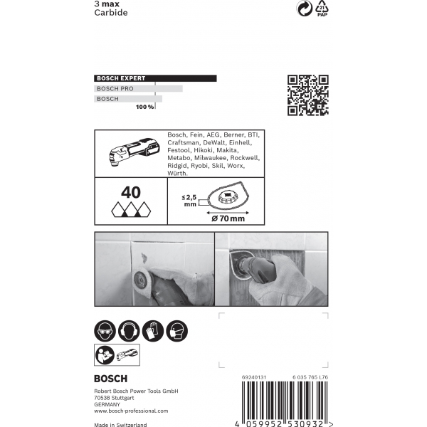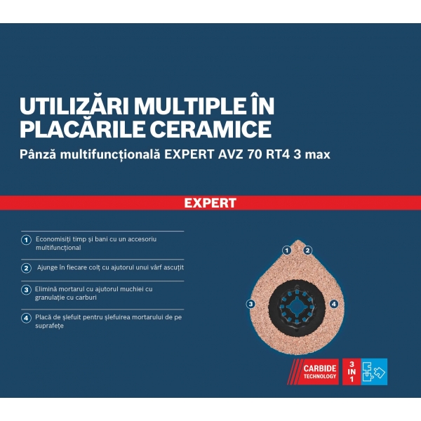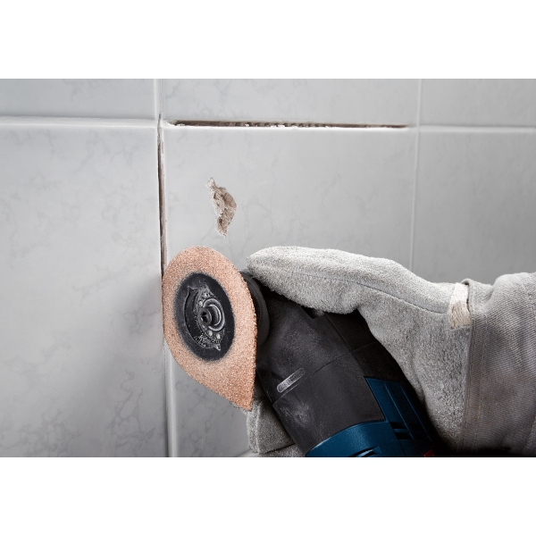 Su exclusiva forma de lágrima permite a la EXPERT AVZ 70 RT4 3 max realizar tres operaciones distintas al reparar baldosas cerámicas, lo que le otorga una excelente relación calidad-precio y garantiza un funcionamiento impecable. Gracias a su grano de carburo de alta calidad, corta fácilmente el mortero alrededor de las baldosas cerámicas y llega incluso a los rincones más estrechos gracias a su punta afilada. La EXPERT AVZ 70 RT4 3 max también funciona como almohadilla de lijado para eliminar el mortero viejo de detrás de las baldosas.