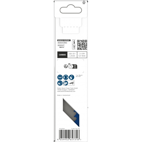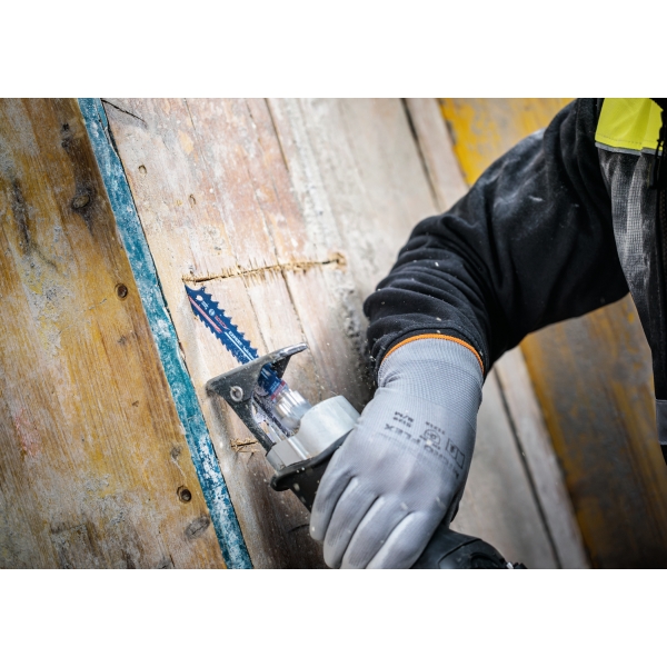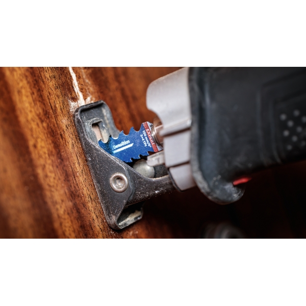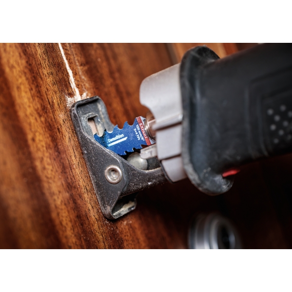 La hoja de sierra recíproca EXPERT para demolición y salvamento multimaterial cuenta con dientes de carburo endurecido ultraduros, diseñados para ofrecer resistencia, durabilidad y un corte muy rápido. El innovador primer diente en forma de garra penetra rápidamente en el material. Gracias a los agresivos dientes de carburo de 3 TPI en la parte superior de la hoja, puede cortar fácilmente en sentido contrario, sin necesidad de invertir la herramienta eléctrica. Las ranuras anchas eliminan las virutas de forma eficiente, lo que facilita el corte de los materiales más duros con una velocidad sin precedentes.