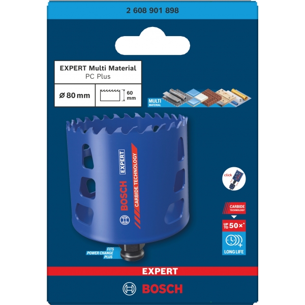 Fabricada con la Tecnología de Carburo de Bosch, cada diente está fabricado con el metal más duro de la más alta calidad, soldado con láser y rectificado seis veces para una forma de corte perfecta. Esto hace que la broca perforadora Bosch EXPERT Multi Material PC Plus sea ideal para trabajos difíciles y para una amplia variedad de aplicaciones: además de madera y metal, es una broca perforadora apta para acero inoxidable, ladrillo, baldosas cerámicas blandas y plásticos reforzados.
