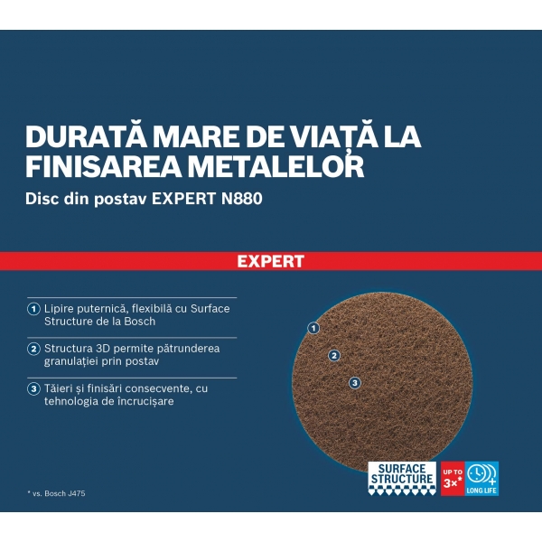 El disco de tela EXPERT N880 es un ejemplo de la Estructura de Superficie de Bosch: combina la última tecnología abrasiva y la experiencia de fabricación en un tejido único y extremadamente duradero. Este producto tridimensional, fabricado con tecnología entrecruzada, ahorra dinero a los profesionales gracias a su rendimiento duradero y minimiza la frustración de lijar a mano hojas que se desprenden.