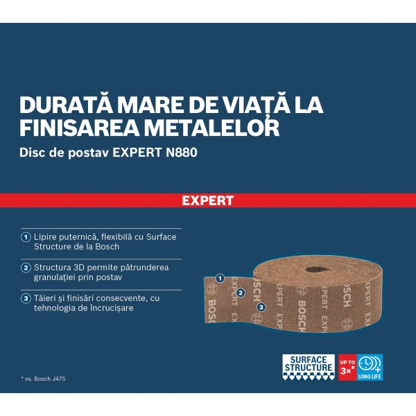 El rollo de tela EXPERT N880 es un ejemplo de la tecnología Surface Structure de Bosch: combina la tecnología abrasiva más avanzada y la experiencia de fabricación en un paño único y extremadamente duradero. Este producto tridimensional, fabricado con tecnología entrecruzada, ahorra dinero a los profesionales gracias a su rendimiento duradero y minimiza la frustración de lijar a mano las hojas, cuyos granos se desprenden.