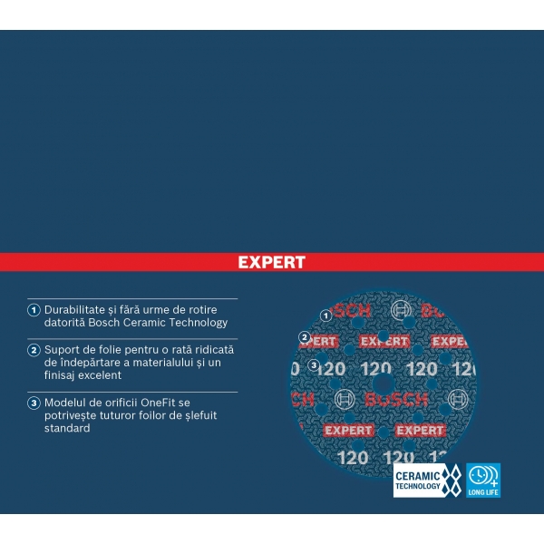 Durabilidad y un acabado de alta calidad sin marcas de lijado gracias a la Tecnología Cerámica de Bosch. Los granos cerámicos se mantienen afilados al romperse, dejando al descubierto nuevos bordes afilados.