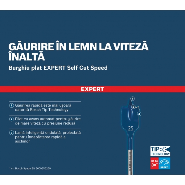 Igualmente fácil de usar en todo tipo de madera blanda, la broca plana Bosch EXPERT Self Cut Speed ofrece eficiencia y comodidad a los usuarios profesionales que necesitan realizar agujeros para cables, tuberías y otro tipo de instalaciones.