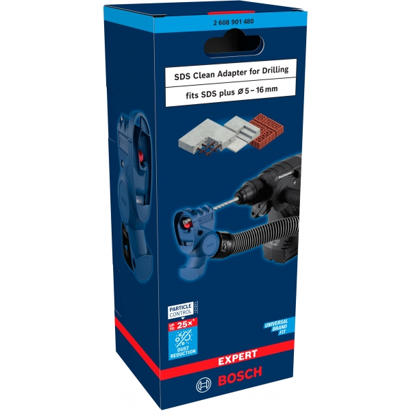 Las nubes de polvo y los pequeños trozos de hormigón que caen de paredes y techos forman parte del proceso de perforación. Llenan el aire de partículas de sílice dañinas y ensucian su lugar de trabajo. Hemos creado este adaptador de perforación EXPERT SDS Clean para ayudarle a eliminar el polvo y los restos de hormigón y así trabajar de forma más eficiente en un entorno más saludable. El adaptador es un accesorio versátil: puede usarlo con cualquier broca SDS plus y la mayoría de los taladros percutores y extractores de polvo SDS.