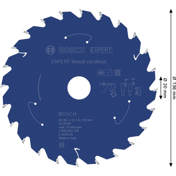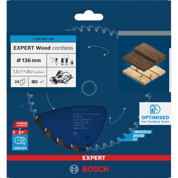 inglésHoja de sierra circular inalámbrica EXPERT Wood, 136 x 1,5/1 x 20 mm, T24