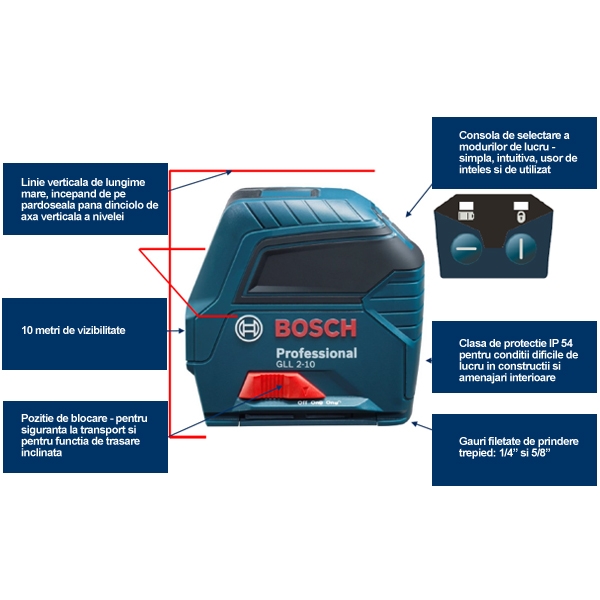 Información adicional | Protección IP54 contra salpicaduras de polvo y agua. El nivel no se puede usar con el receptor profesional Bosch LR 2 Color de línea láser: rojo | Protección contra polvo y agua: IP 54 |