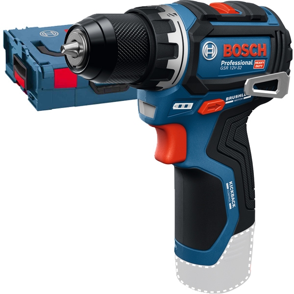 Información adicional: El GSR 12V-32 Professional está equipado con Advanced KickBack Control , un motor sin escobillas , un mandril de metal robusto , una potente luz de trabajo y un clip para cinturón .