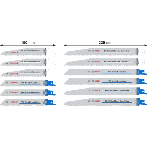 El juego incluye una selección de hojas de sierra recíproca PRO de alta eficiencia para realizar cortes robustos en diversos materiales de construcción. Su robustez se debe a su construcción bimetálica, que combina un cuerpo grueso de HCS con dientes de HSS endurecidos. No importa lo que necesite demoler, este juego está a su disposición, y cada hoja ofrece una larga vida útil.