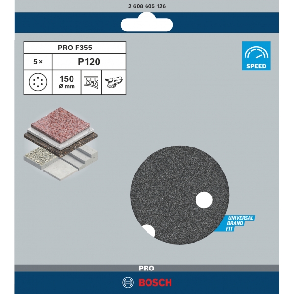Bosch - PRO F355 - Juego hojas abrasivas redondas, 150 mm, 600 granulación, 6 noches, 5 piezas