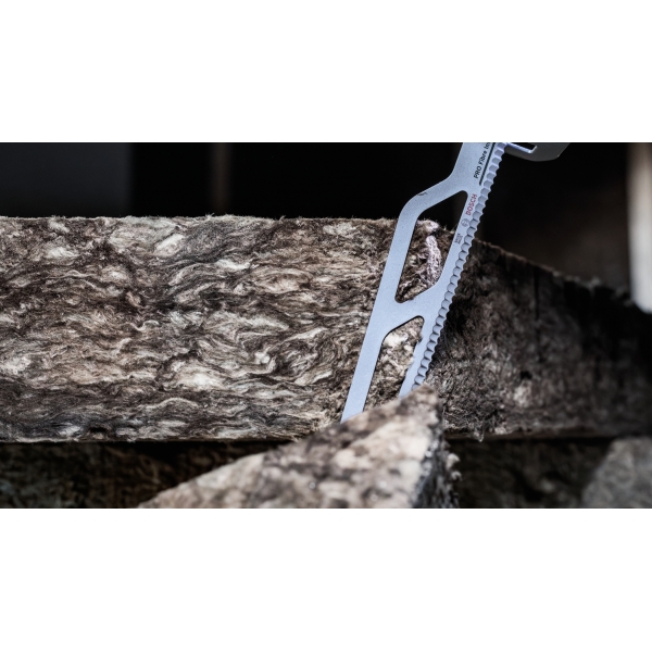 El filo dentado del aislante de fibra PRO S1213AWP está diseñado para materiales aislantes sintéticos, mientras que su cuerpo ancho proporciona un corte estable y su punta perfilada permite a los profesionales cortar donde deseen. No es apto para aislamientos de fibra natural ni de madera.