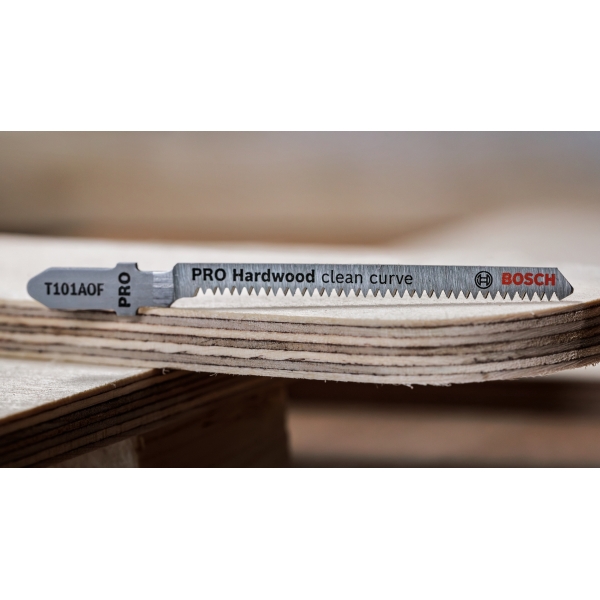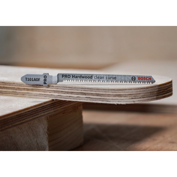La hoja de sierra caladora bimetálica (BIM) PRO Hardwood Clean Curve T101AOF cuenta con una banda de dientes de acero de alta velocidad (HSS) adherida a un cuerpo de acero de alto carbono (HCS) para ofrecer la resistencia necesaria para cortar madera dura y laminados con facilidad. La hoja estrecha y cónica permite cortar curvas, mientras que los dientes afilados y rectificados garantizan cortes limpios. Úsela para cortar piezas de hasta 15 mm de espesor.
