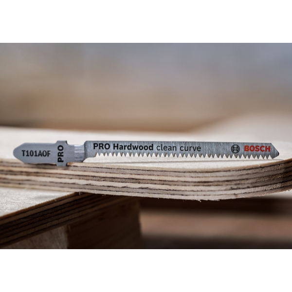 La hoja de sierra caladora bimetálica (BIM) PRO Hardwood Clean Curve T101AOF cuenta con una banda de dientes de acero de alta velocidad (HSS) adherida a un cuerpo de acero de alto carbono (HCS) para ofrecer la resistencia necesaria para cortar madera dura y laminados con facilidad. La hoja estrecha y cónica permite cortar curvas, mientras que los dientes afilados y rectificados garantizan cortes limpios. Úsela para cortar piezas de hasta 15 mm de espesor.