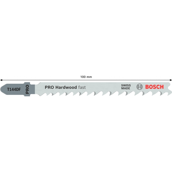 Hemos fabricado la hoja de sierra de calar PRO Hardwood fast T144DF con Bi-metal: cuenta con una banda de dientes de acero de alta velocidad (HSS) adherida a un cuerpo de acero de alto carbono (HCS), para garantizar que pueda trabajar con facilidad en madera dura y compuesta. Los dientes, dispuestos en un lado, son afilados y tienen avance progresivo para cortes rápidos.