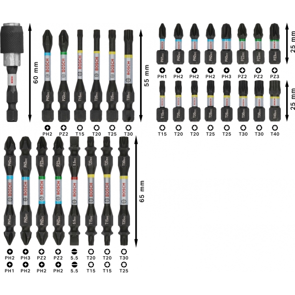 -tamaños: PH1/PH2, PH2/PH3, 2xPH2/PZ2, 2xT15/T20, T25/T30, SL1x5.5/SL1x5.5