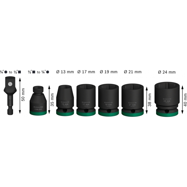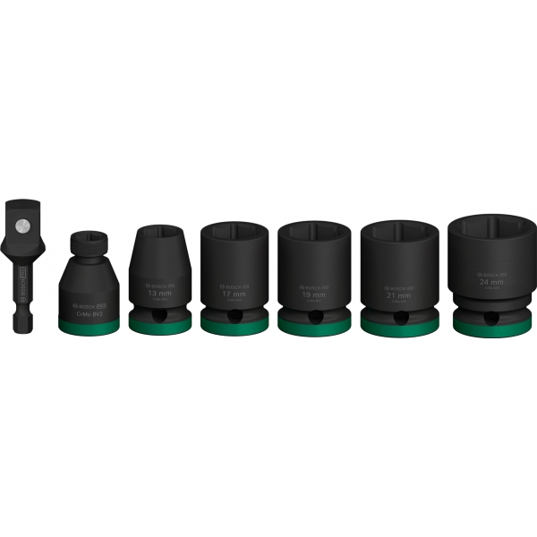 Las llaves del juego de vasos de impacto PRO con adaptador están fabricadas en acero CRMO (cromo molibdeno) tratado térmicamente y tienen paredes gruesas para garantizar un alto par de apriete. Les hemos añadido un revestimiento de fosfato negro para protegerlas de la oxidación y la corrosión. Las llaves están marcadas con láser y codificadas por color para que pueda identificar la que necesita al instante. Cuentan con una ranura y un orificio para conectarlas a su atornillador de impacto mediante un pasador y un anillo, siempre que necesite un agarre firme. Los adaptadores le permiten usar los vasos con taladros de impacto y puntas hexagonales con atornilladores de impacto para aplicaciones de menor potencia con un par de apriete inferior a 80 Nm.
